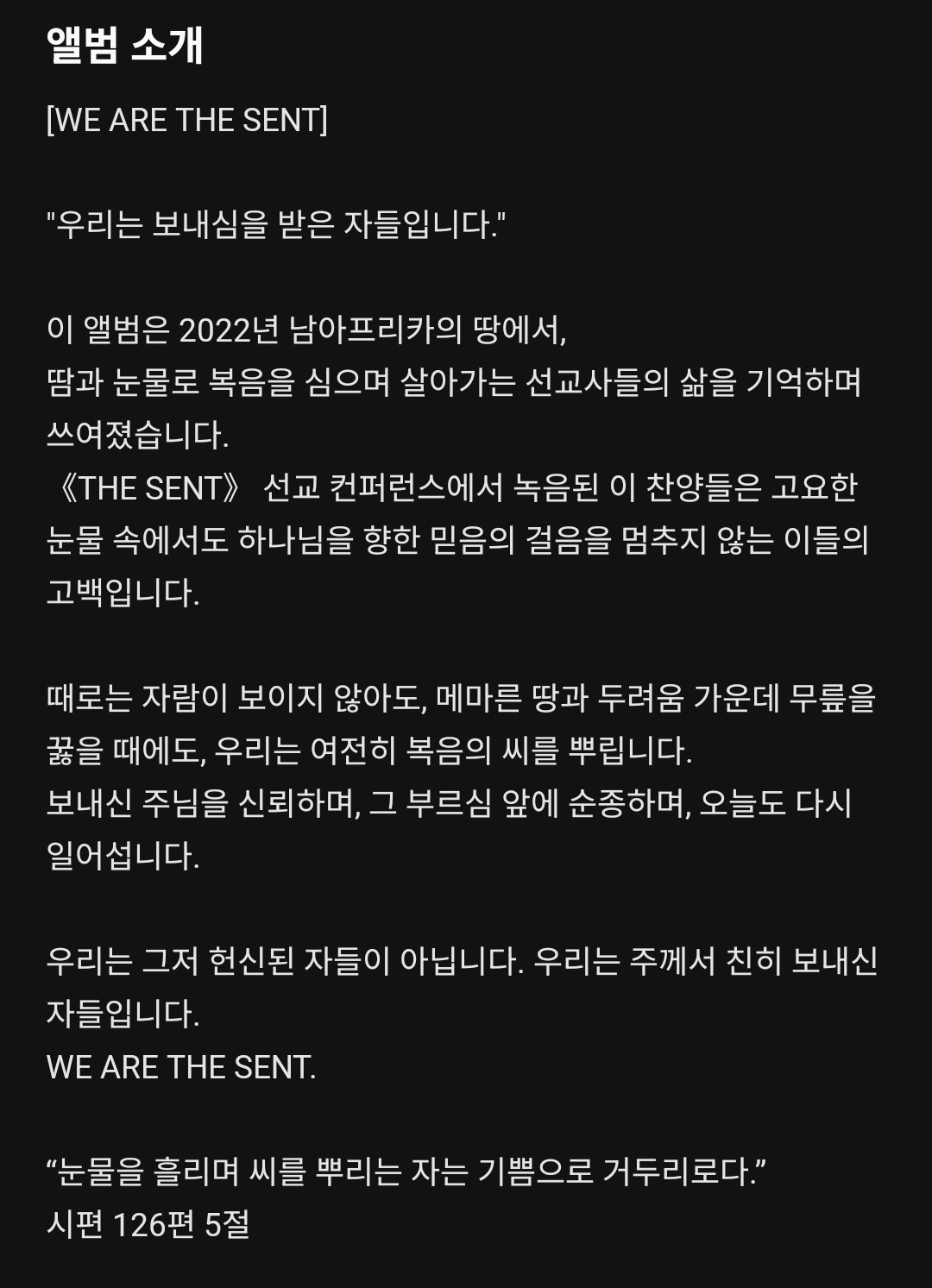 복음의 씨앗을 눈물로 뿌리며 살아가는 선교사님들을 기억하며 만든 찬양들은, 각자의 부르심의 자리에서 인내하며 살아가는 우리 모두에게 동일한 위로와 격려가 됩니다.