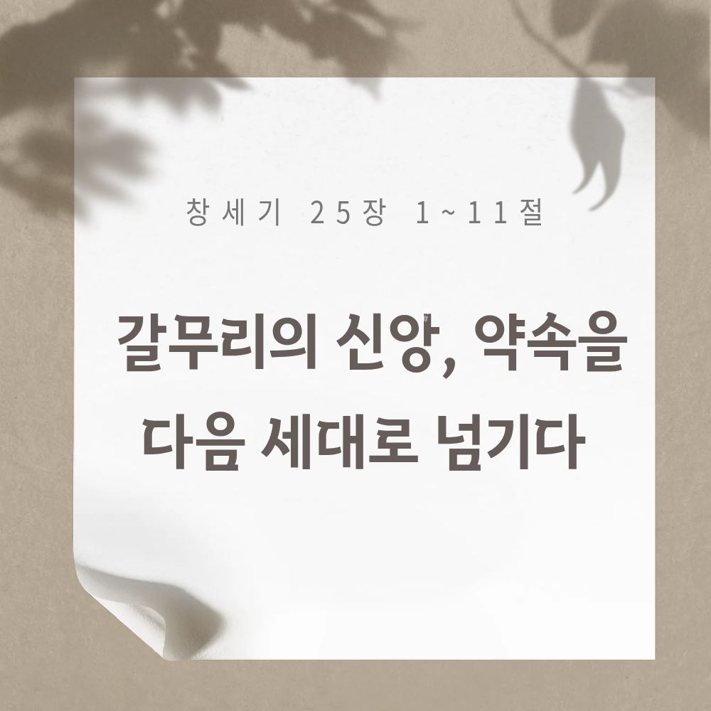 신앙은 한 세대에서 끝나서는 안 된다.계속해서 다음 세대로 물려주어야 할 믿음이 있다.그렇다면 이 시대를 살아가는 우리의 역할은 무엇일까?창세기 24장 28–67절은아브라함의 종, 리브가, 이