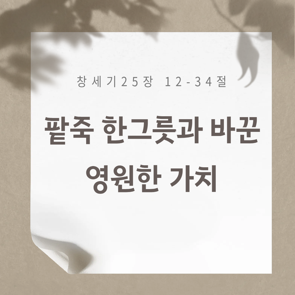 창세기 25장 12-34절은 하나님의 주권적인 역사 속에서 이루어지는 일들을 보여주면서도, 동시에 인간의 선택과 책임이 얼마나 중요한지를 강조하는 말씀이다. 이 본문은 특별히 인간의 책임에 초점을 맞추어 우리 삶을 돌아보게 한다.