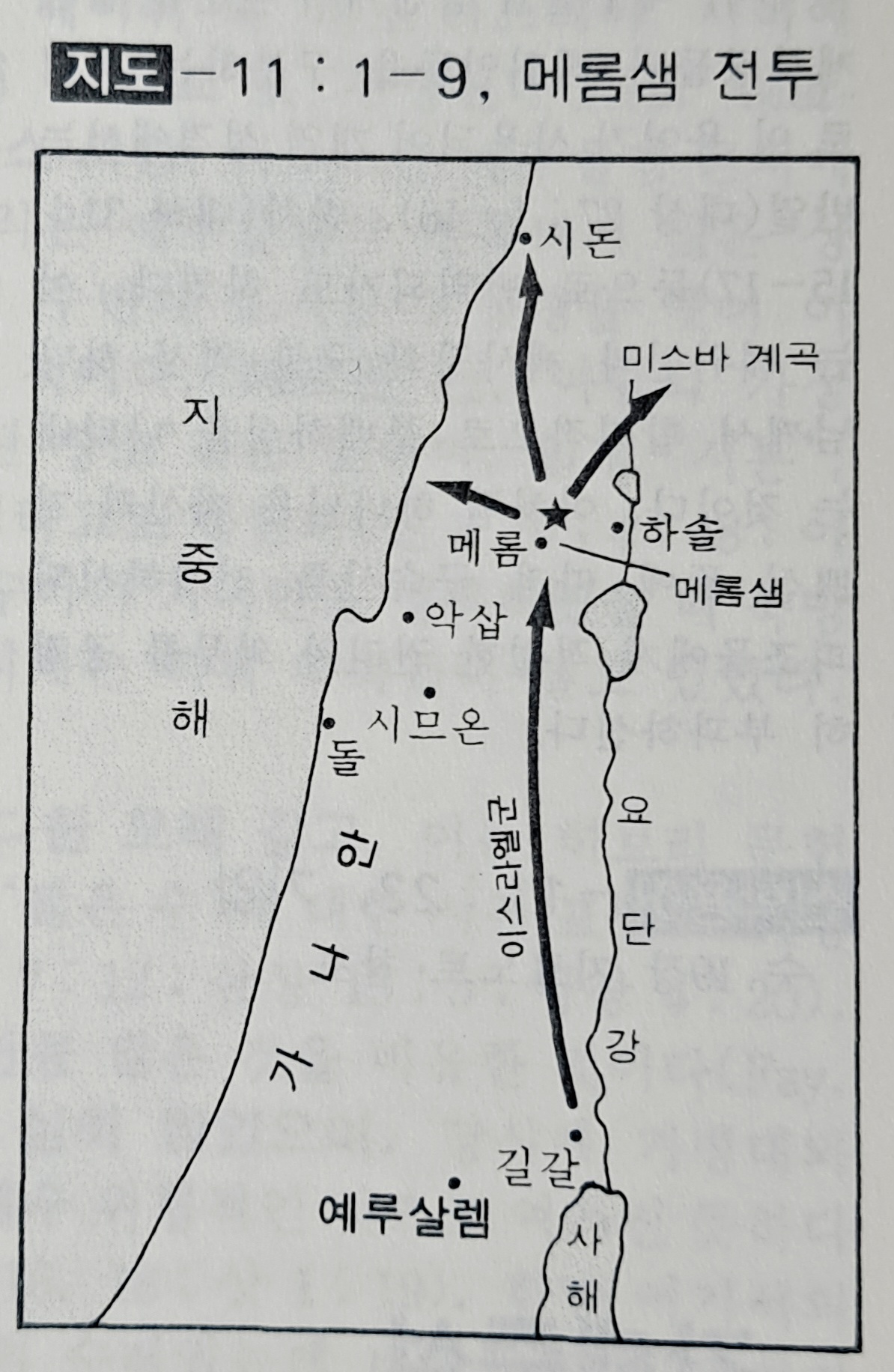 하솔왕 야빈이 가나안 북부 연합군을 결정하여 모든 군대를 거느리고 이스라엘과 싸우려고 메롬 물가에 함께 진침(해변의 수많은 모래 같고 말과 병거도 심히 많음)