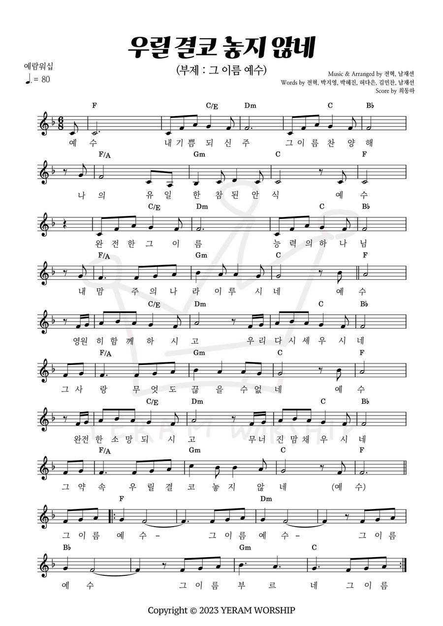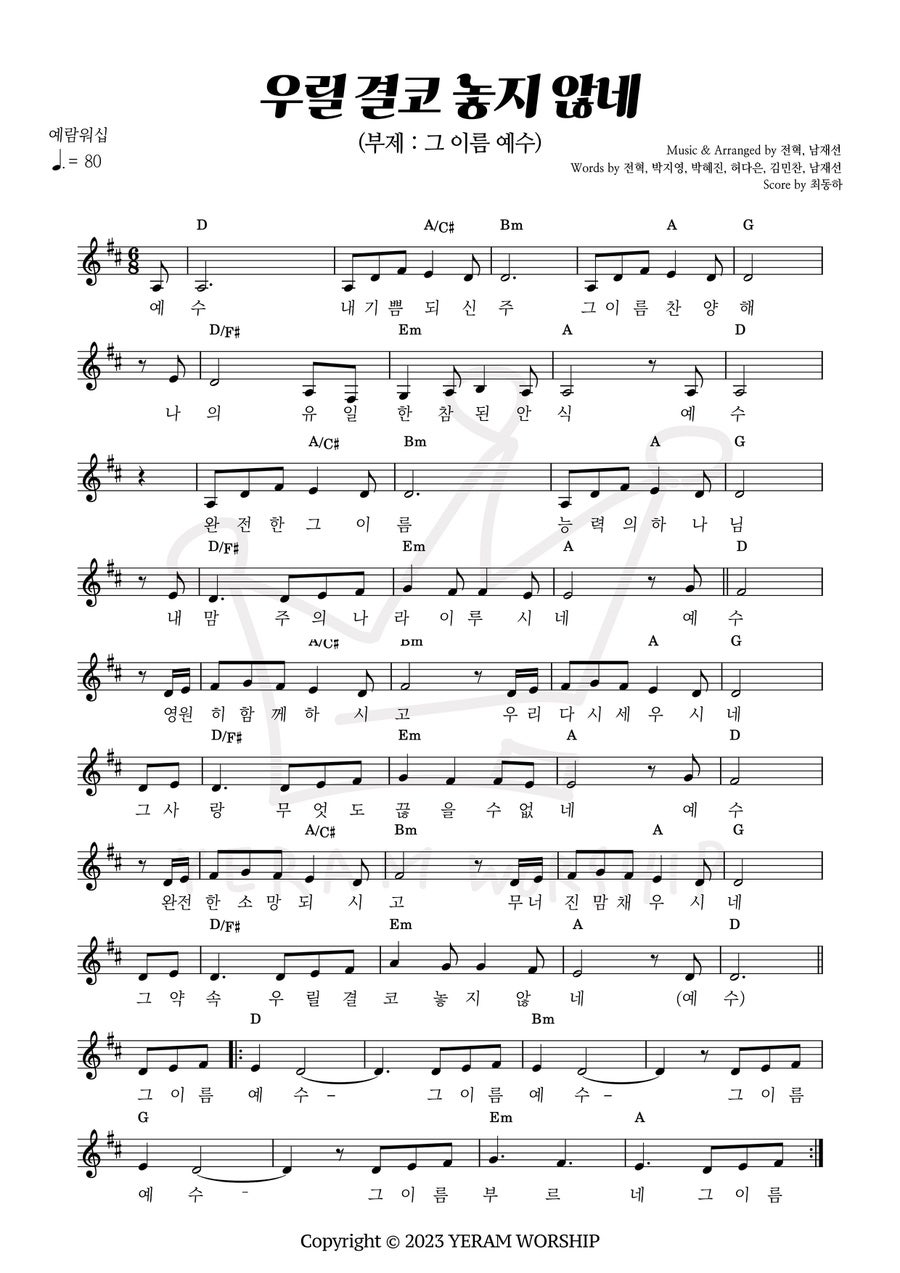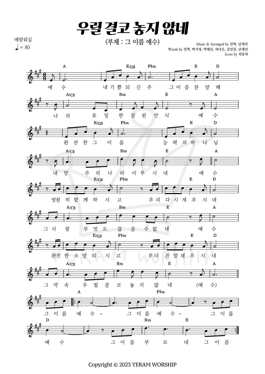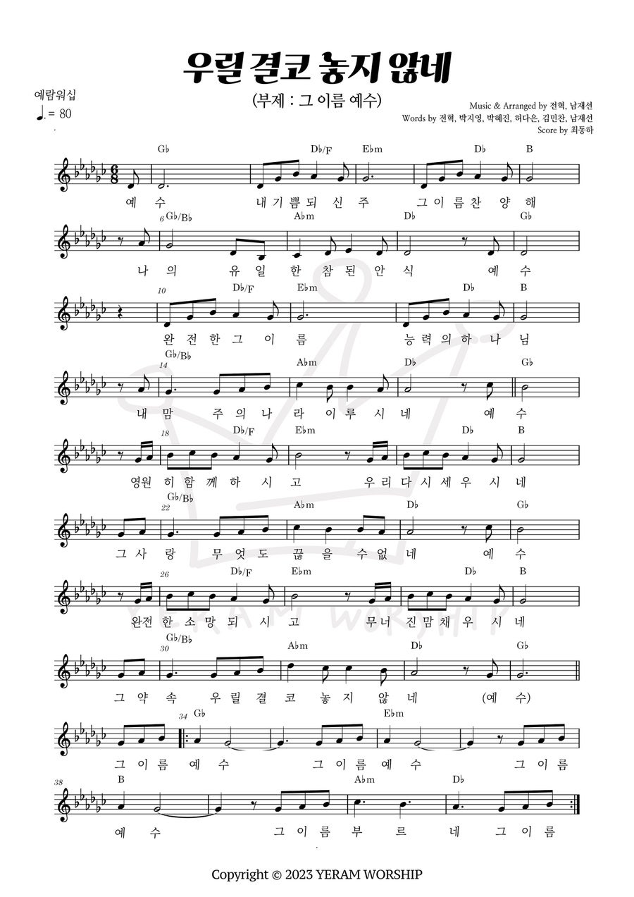 예람워십은 한글 타이틀과 함께 영어로 부제를 붙이는데 우릴 결코 놓지 않네의 주제는 그 이름 예수 What a beautiul name입니다.