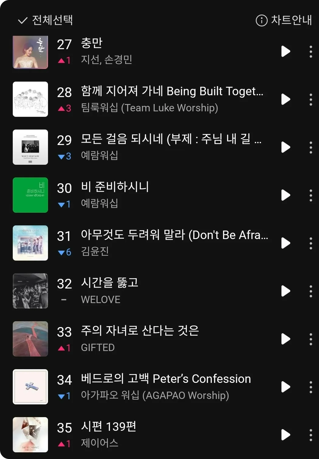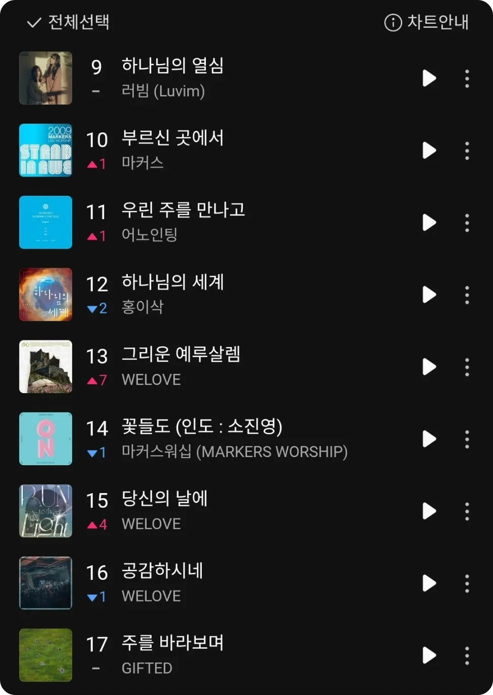 그밖에 일반음원 순위에서도 높은 순위를 차지했던 WELOVE의 어두운 날 다 지나고 와 밝고 트렌디한 곡으로 많은 사랑을 받고 있는 팀룩워십의 주를 찾는 모든 자들이 도 오랫동안 상위권에 있는 곡입니다.