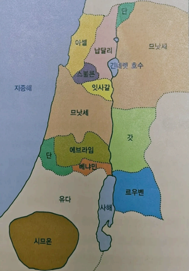 요단동편에 두지파 반 (르우벤, 갓, 므낫세 반지파) 가나안 땅에 유다와 요셉의 두 아들 에브라임, 므낫세 반지파 이렇게 세지파가 땅을 분배 받았고 레위지파는 기업이 없기에 나머지 일곱지파(